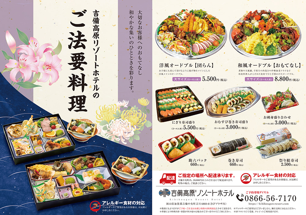 仕出し料理、お祝い料理、お寿司やオードブルなどご予約いただければ各種ご用意いたします。